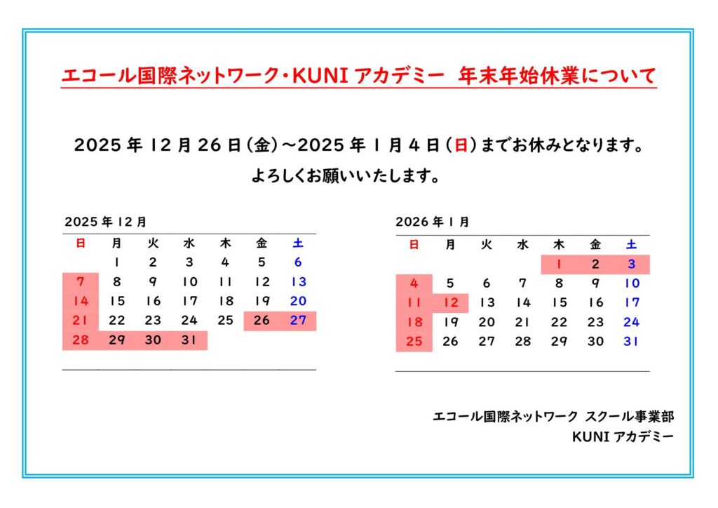 年末年始の休業日について 2025年12月15日 エコール1号 News, Slider 師走の候、皆様におかれましては、ますます御健勝のこととお慶び申し上げます。また、平素は格別のご高配を賜り、厚く御礼申し上げます。 誠に勝手ながら、株式会社エコール国際ネットワークでは、下記期間につきまして、年末年始のため休業とさせていただきます 。 何卒ご容赦の程、お願いいたします。