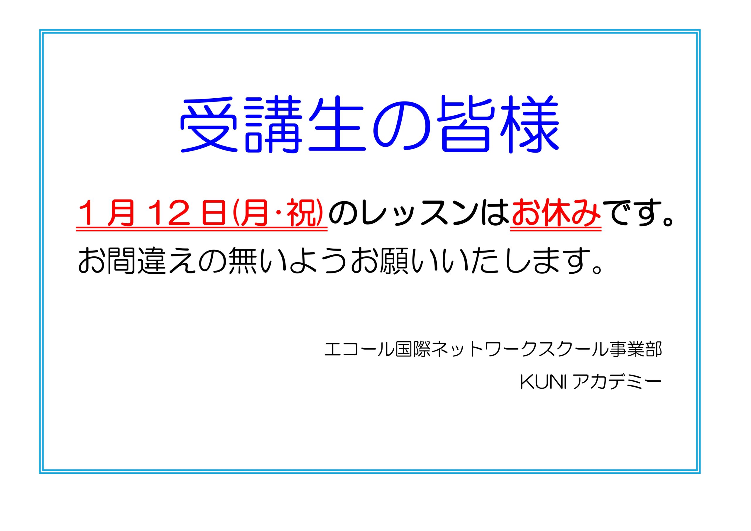 1/12(月・祝)のレッスンは終日お休みとなります。