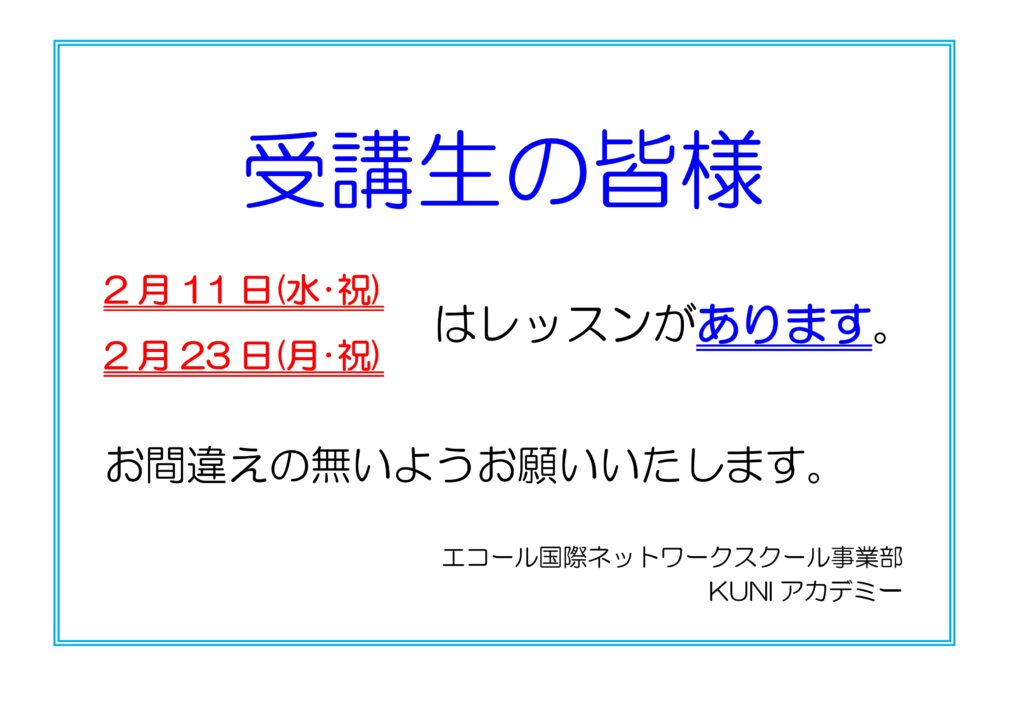 2月の祝日レッスンについて 2026年1月20日 エコール1号 News, Slider 2/11(水・祝)および2/23(月・祝)はレッスンがあります。お間違えの無いよう、お願いいたします。 \ 最新情報をチェック /